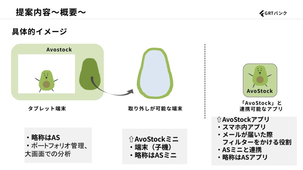 生成AIと金融の組み合わせに面白さを感じこのテーマを選択し、斬新で既存事業にも負けず、親しみを持って使ってもらえるものの提案に努めました。種を植えることで木になるアボカドで成長やワクワクをイメージさせ、顧客が安心して証券取引を行い人生が豊かになるものを提供できればと「AvoStock」という商品を考案し、アボカドのキャラクターを設定しました。企業側からのフィードバックでは「アボカドをメインにキャラクターやデバイスを設定したのは面白かったが、実現性という点が課題でこのような評価とさせていただいた」とのコメントをいただきました。他大学チームと僅差だったということで、SWOT分析などにより導いた、現状の課題と提案の根拠を伝えきれなかった点が悔やまれます。この経験から、相手にどのようにわかりやすく伝えたい点を伝えられるかが重要だということを学びました。今後、必ず社会で必要なスキルだと思うので、残りの学生生活でさらに力を磨いていきたいです。